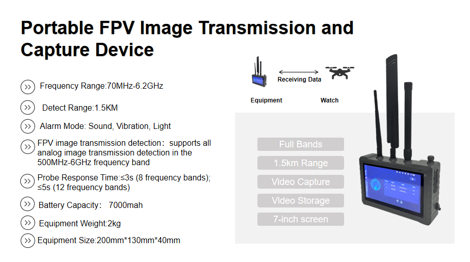 | FPV Image Transmission Detection | Supports all analog image transmission detection in the 500MHz-6GHz frequency band (supports user customization). |