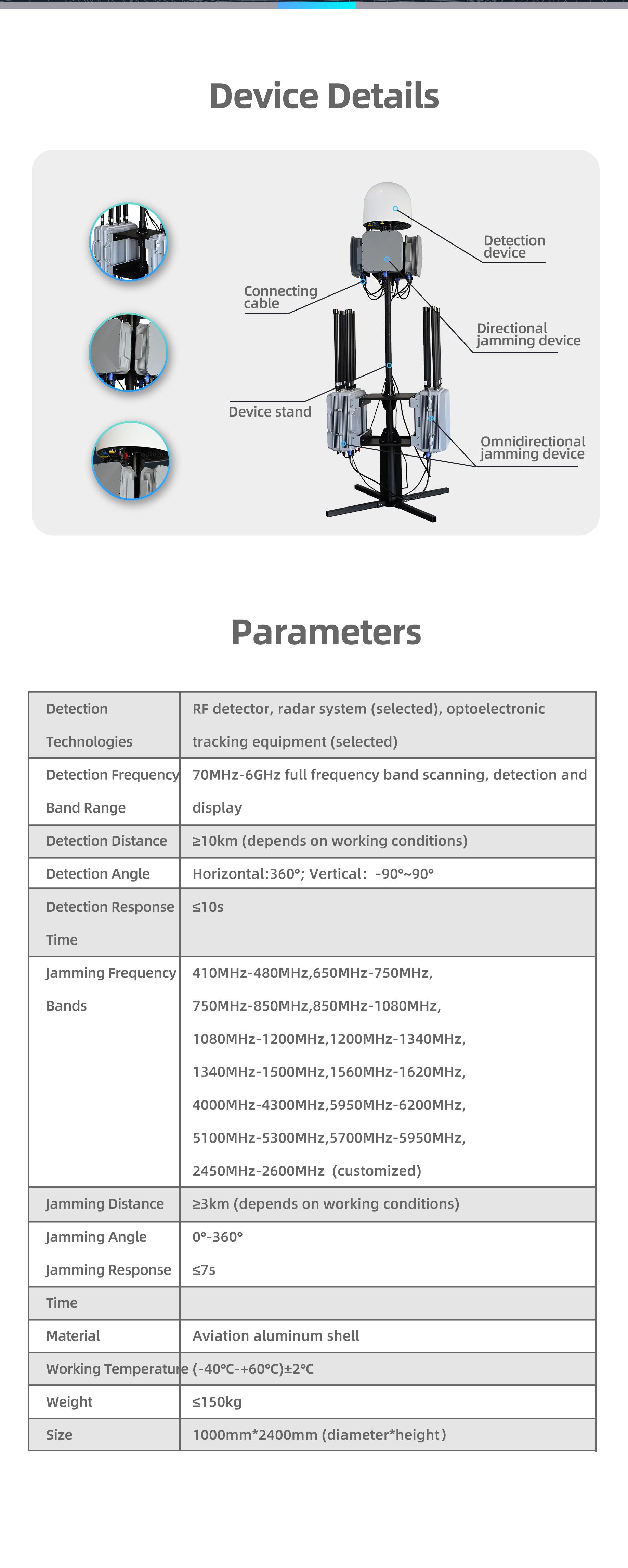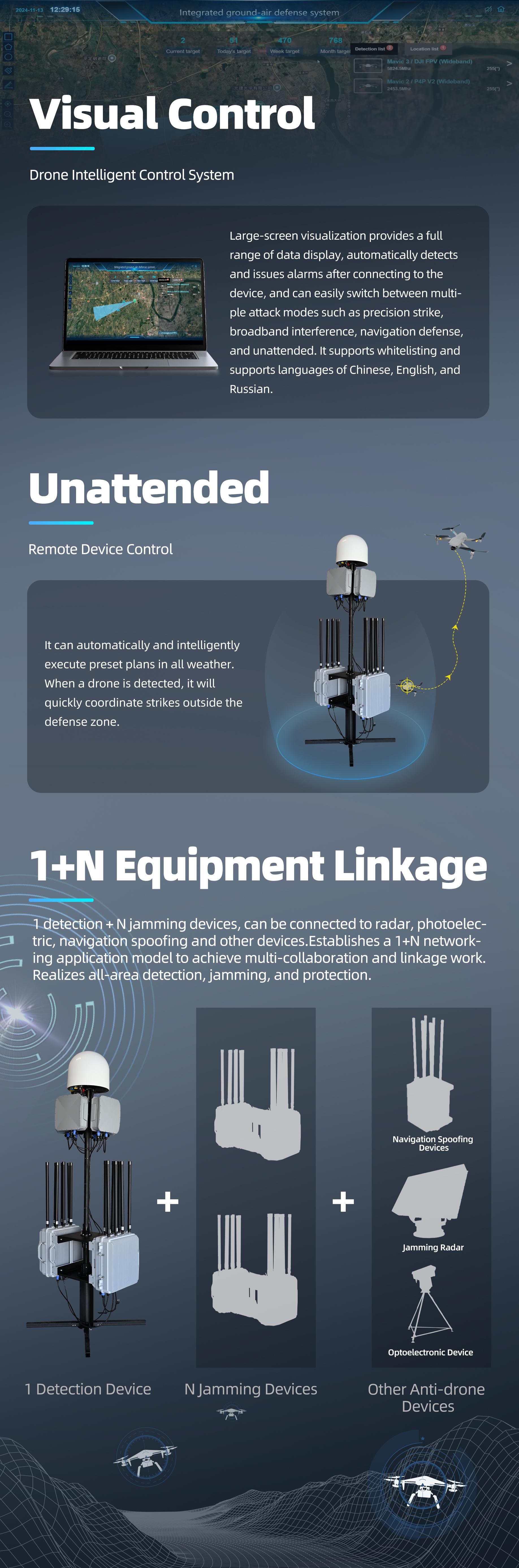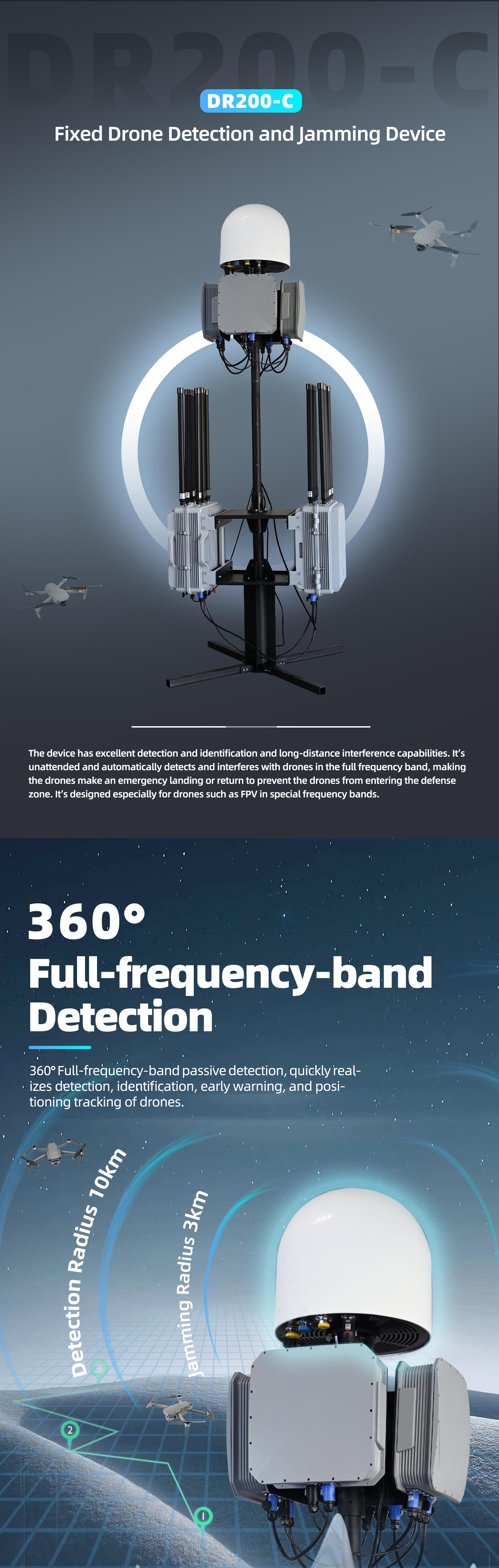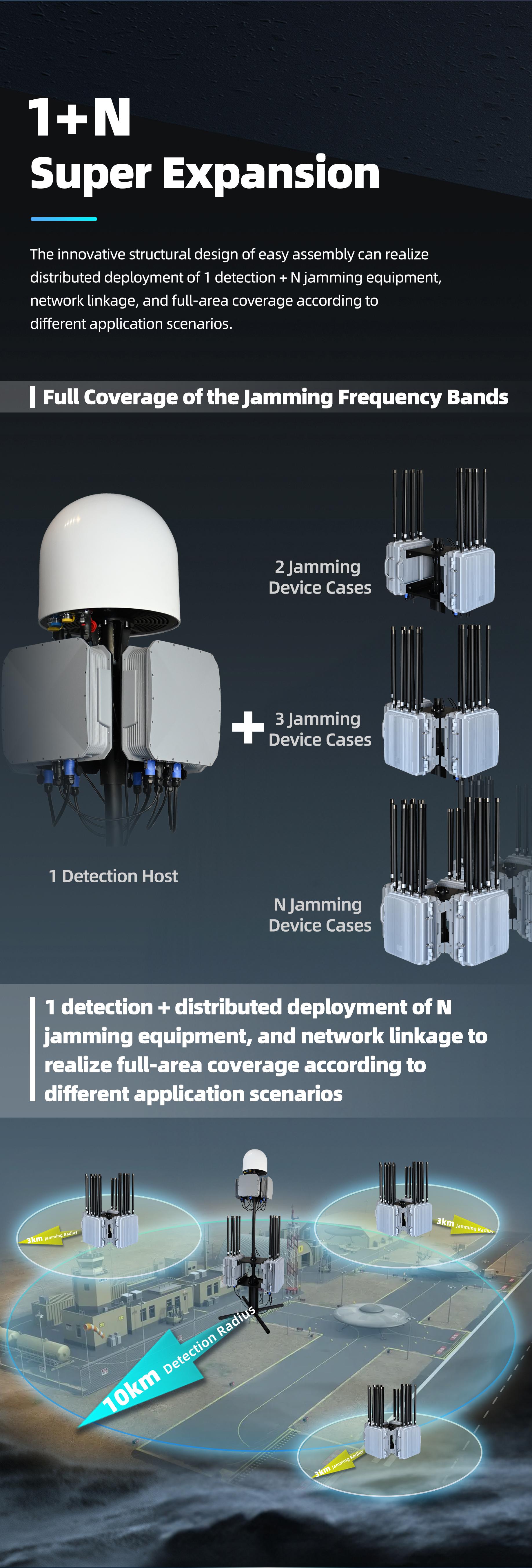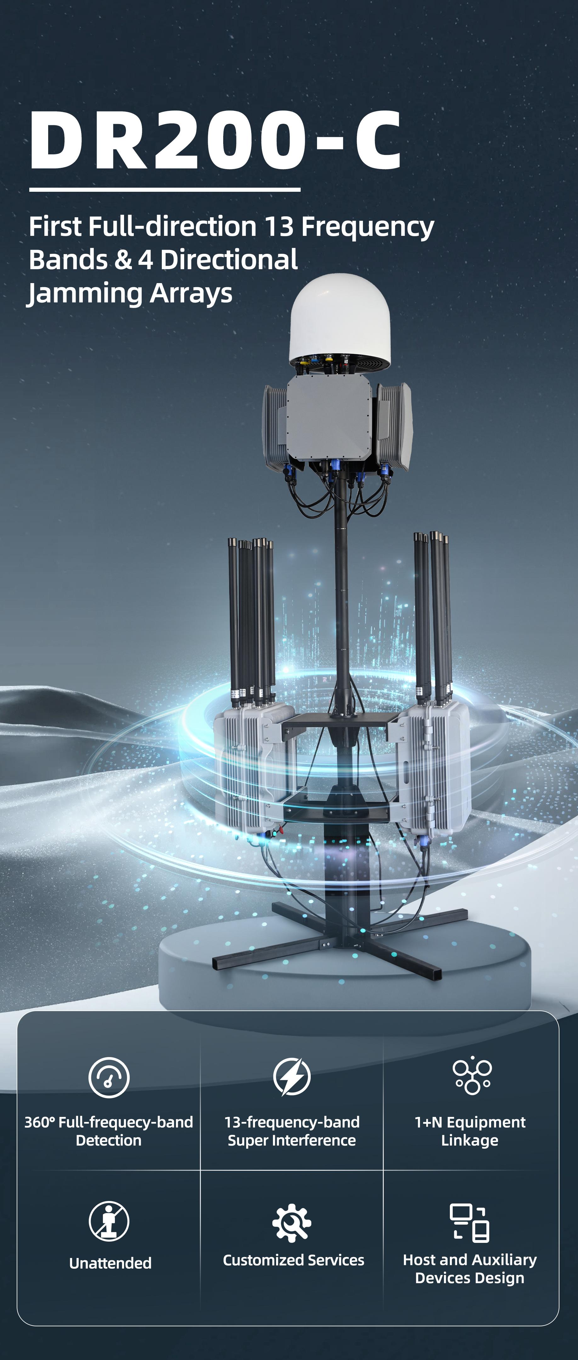 • 70MHz-6000MHz Full-band DR200-C 10KM Detect Range 1+N Super Expansion 4 Directional Anti-band + 13 Omnidirectional Jammer Drone Detection and Jammer Integrated System
