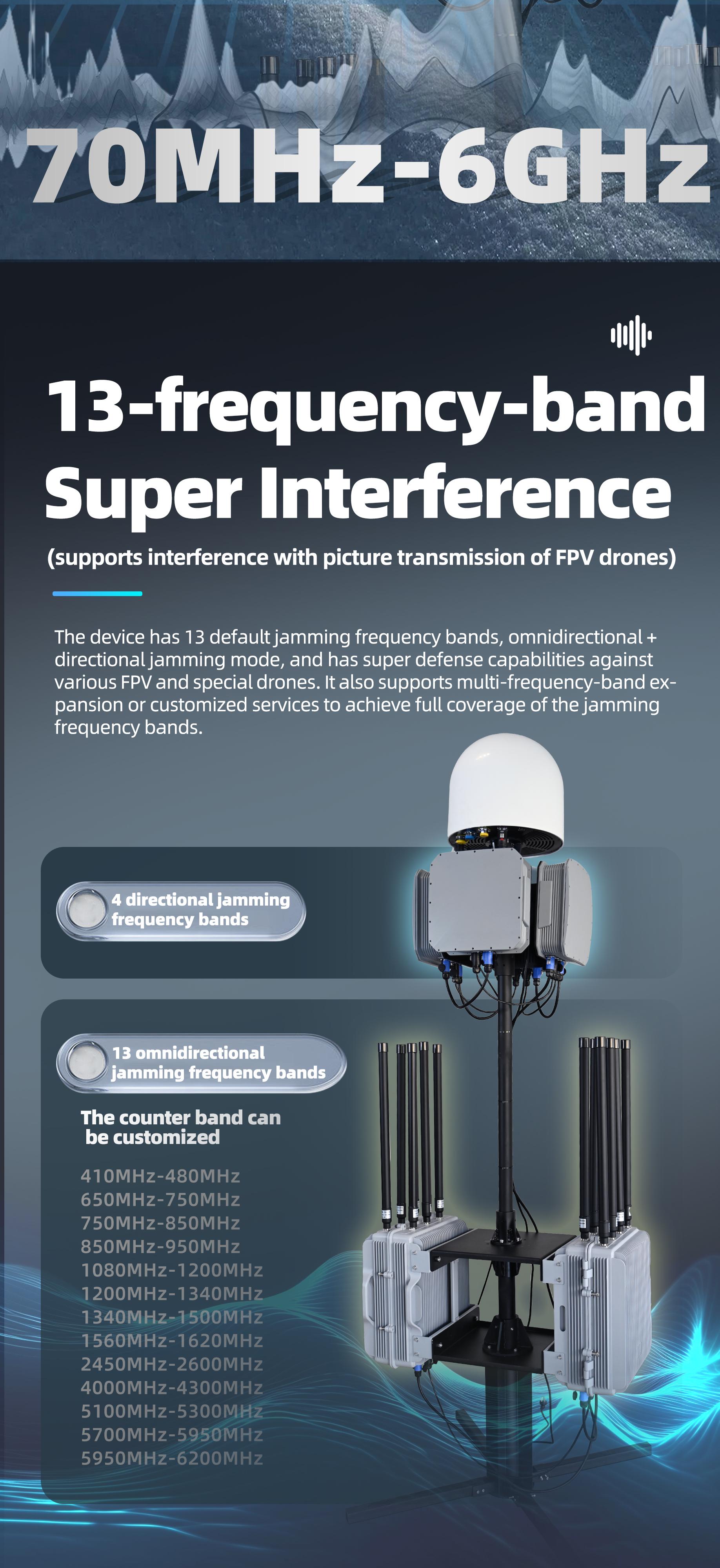 It can support full-band detection and extended radar optoelectronic equipment, etc. It has 13 bands omnidirectional jamming and 4  bands directional anti frequency bands, and can be used in networking.