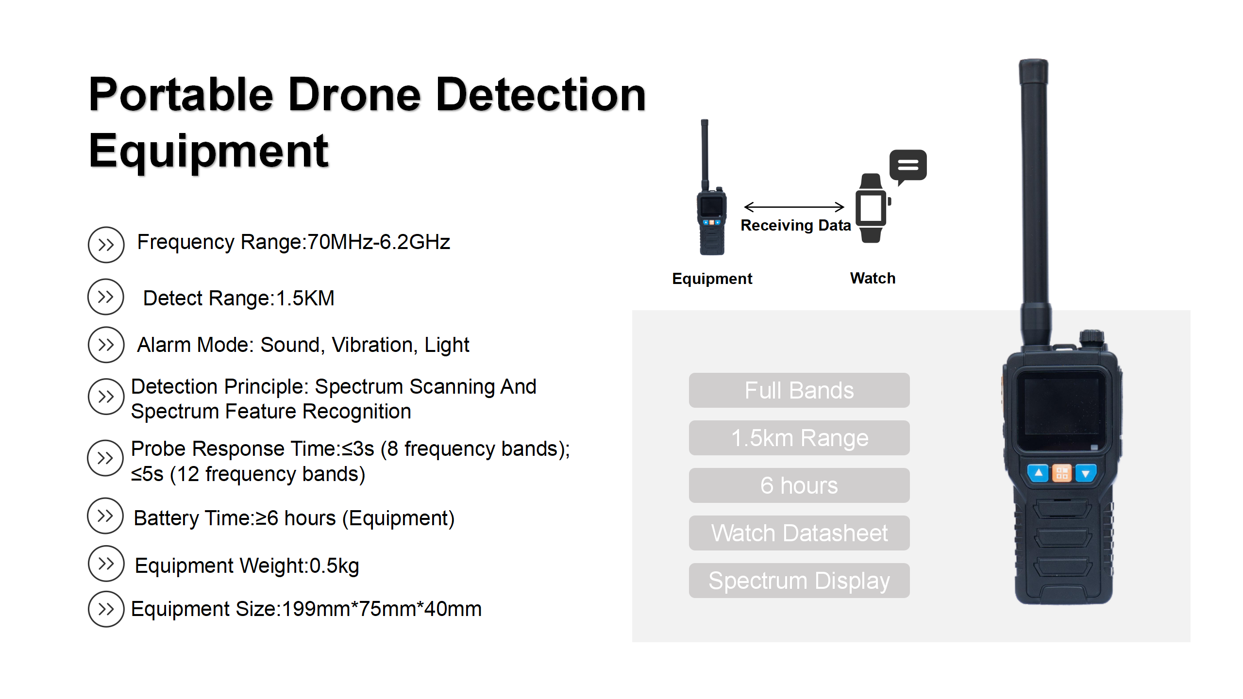 Supports customizable scanning from 70MHz to 6.2GHz (default detection bands: 400MHz, 800MHz, 900MHz, 1.2GHz, 1.4GHz, 2.4GHz, 5.2GHz, 5.8GHz; other bands can be customized). |