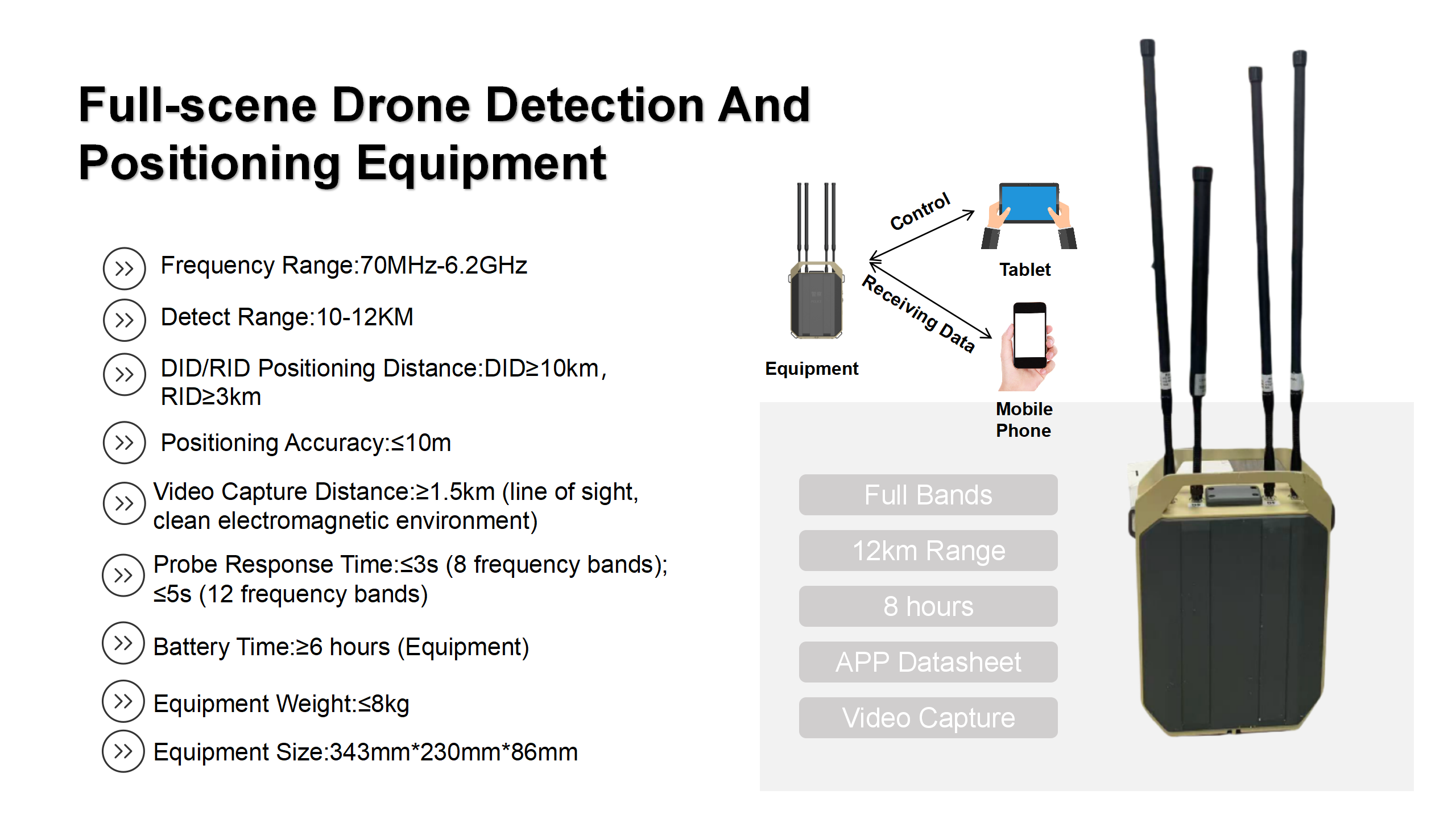 Supports 70MHz-6.2GHz custom scanning (default detection frequency bands: 400MHz, 800MHz, 900MHz, 1.2GHz, 1.4GHz, 2.4GHz, 5.2GHz, 5.8GHz; other frequency bands can be customized); |