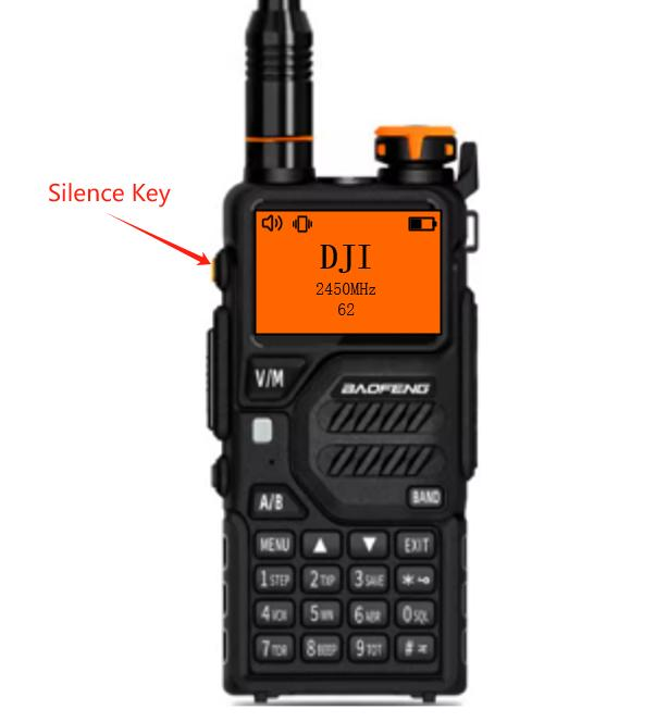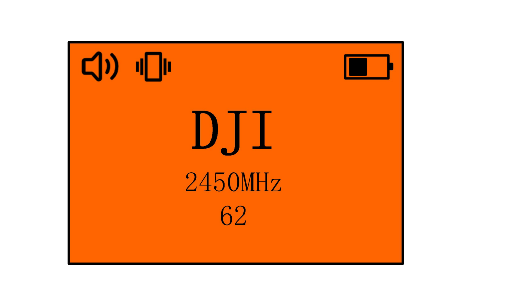 When detecting a drone, the screen will automatically light up, turn red, and display the drone information: a. Drone Type: DJI, AUTEL, FPV, DIY . b. Drone Frequency (MHz). c. Signal Strength: e.g., 62.