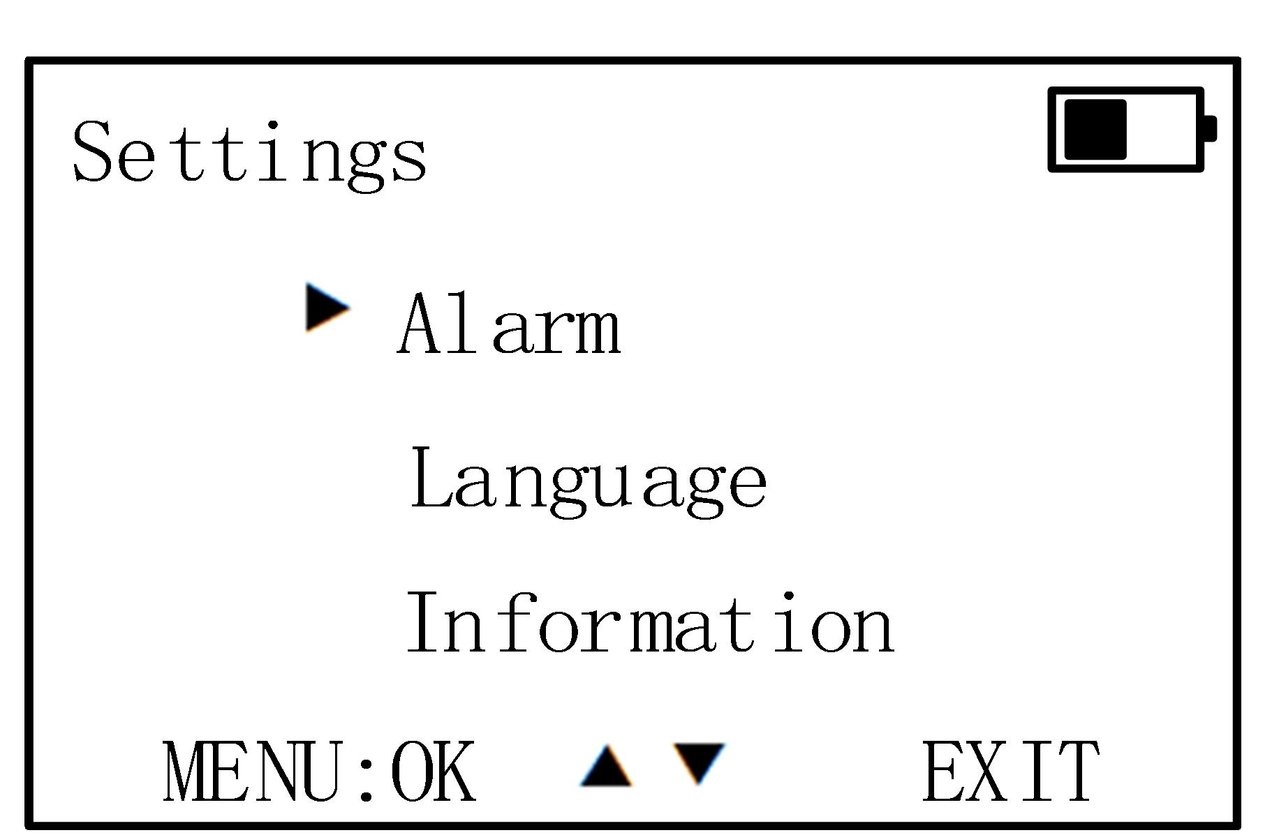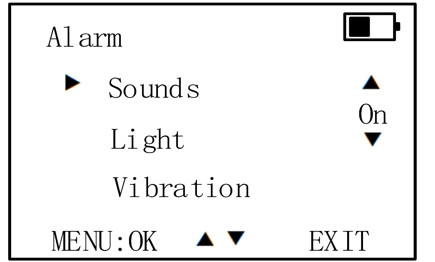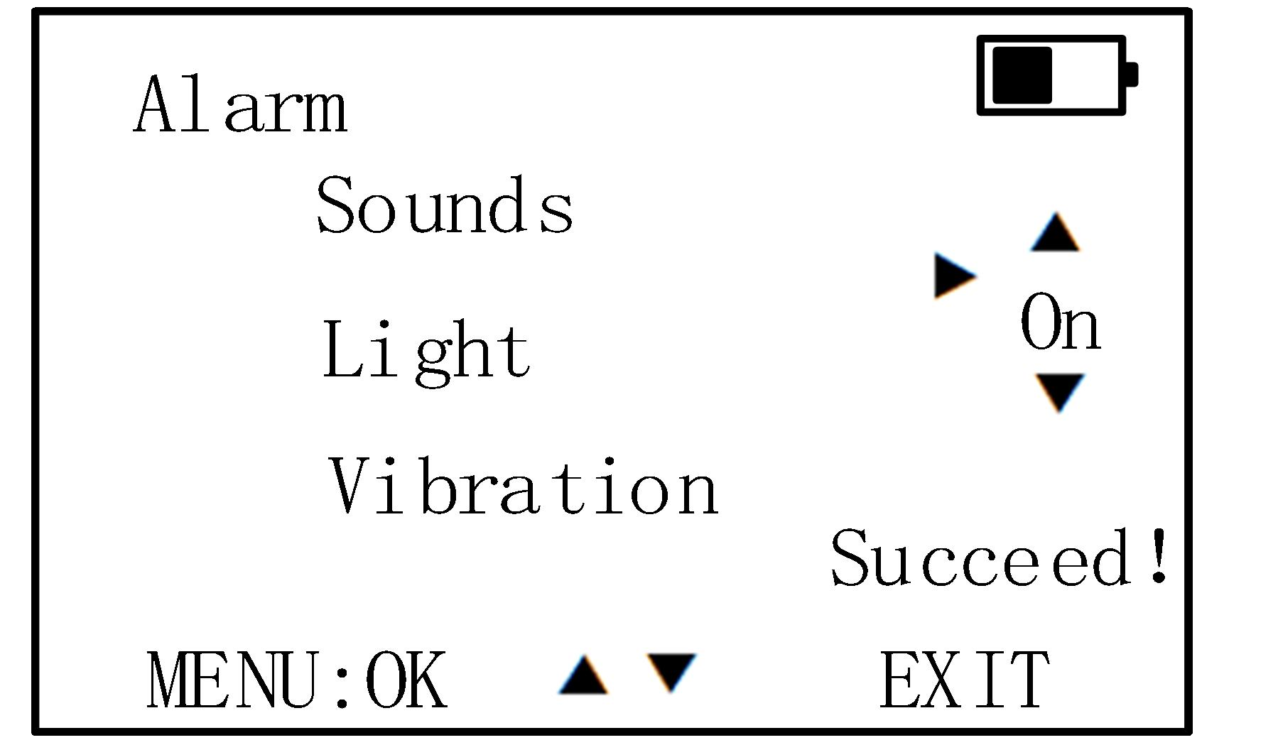 Simultaneously, the buzzer emits a "beep beep" alarm sound, the entire device vibrates, and the indicator light on the front panel of the device flashes. (5) Cancel Alarm: When the device is in the alarm state, pressing the orange "Silence Key" button once will stop the buzzer from sounding the alarm and cease the vibration. The device will enter a silent state for 10 seconds. If a drone is detected again after those 10 seconds, the device will resume its normal alarm function. (6) System Settings: Press the 【MENU】 button once to enter system settings. Use the【▼] and 【▲】 buttons to navigate through the function menu. The 【MENU】 button serves as the confirmation key, while the 【EXIT】button is used to exit. After selecting a function item, press 【MENU】to save (a "Save Successful!" prompt will appear), and then press【EXIT】 to exit the settings. (Note that upon powering on, the system will default to saving the settings from before the last power-off.) Alarm Settings: Press the [MENU] button to enter the Alarm Settings, as shown in the figure below(left picture) Press the 【▼】and 【▲】 buttons to select among sound, light, and vibration options. Once you have chosen the alarm mode, press the 【MENU】button to switch to the on/off key for that function. At this point, pressing the 【▼】 and 【▲】 buttons will allow you to toggle the function on or off. Pressing the 【MENU】 button again will save the setting, and a "Save Successful!" prompt will appear at the bottom of the screen (as shown in the figure below). Finally, press the 【EXIT】 button to exit.(right picture)