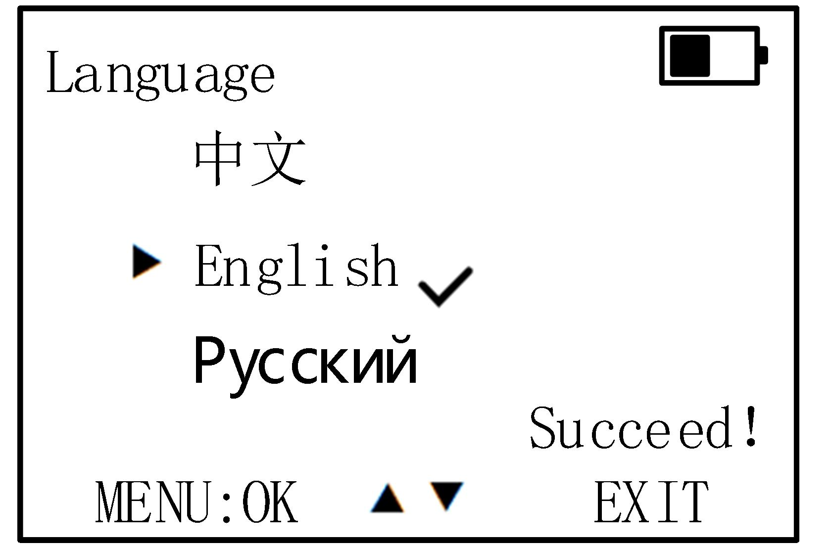 Language: Press the [MENU] button to enter the Language Settings, as shown in the figure below(left picture) Press the [▼] and [▲] buttons to select among Chinese, English, and Russian options. Use these buttons to choose the desired language. Once selected, press the [MENU] button to save the setting. A "Save Successful!" prompt will appear at the bottom of the screen (as shown in the figure below). Finally, press the [EXIT] button to exit.(right picture)